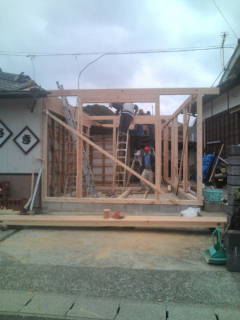 先日から倉庫を解体して新しく改築する準備をしていましたが、今日はいよいよ建家です![]()