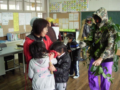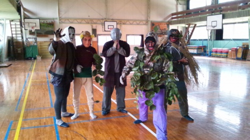 5人の男衆がヤマンジ〜に変身して第1の場所、小学校へ降臨