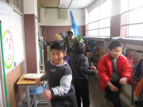さすがに低学年はいいリアクションするな〜と十分びびらせたところで3階の3・4年と5・6年の教室へ2つに分かれて出撃