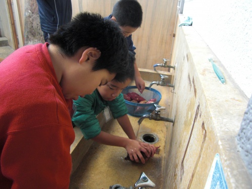 そのサツマイモを1・2年生ががゴシゴシ洗い、3・4年生が皮を剥き、5・6年生がスライスにする道具を使ってスライスにし、茹でて干す!といった素晴らしい流れ作業![]()