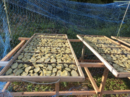 サツマイモをスライスにし、茹でて干した物を「かんころ」と呼ぶのですが、言わずと知れた「かんころ餅」の原材料です![]()