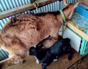 なのでいつものようにハルが食事をしてる時に後ろ脚を掴み、子ヤギが乳を飲めるようにしてあげてるのですが、一つ気になる事がありまして・・・